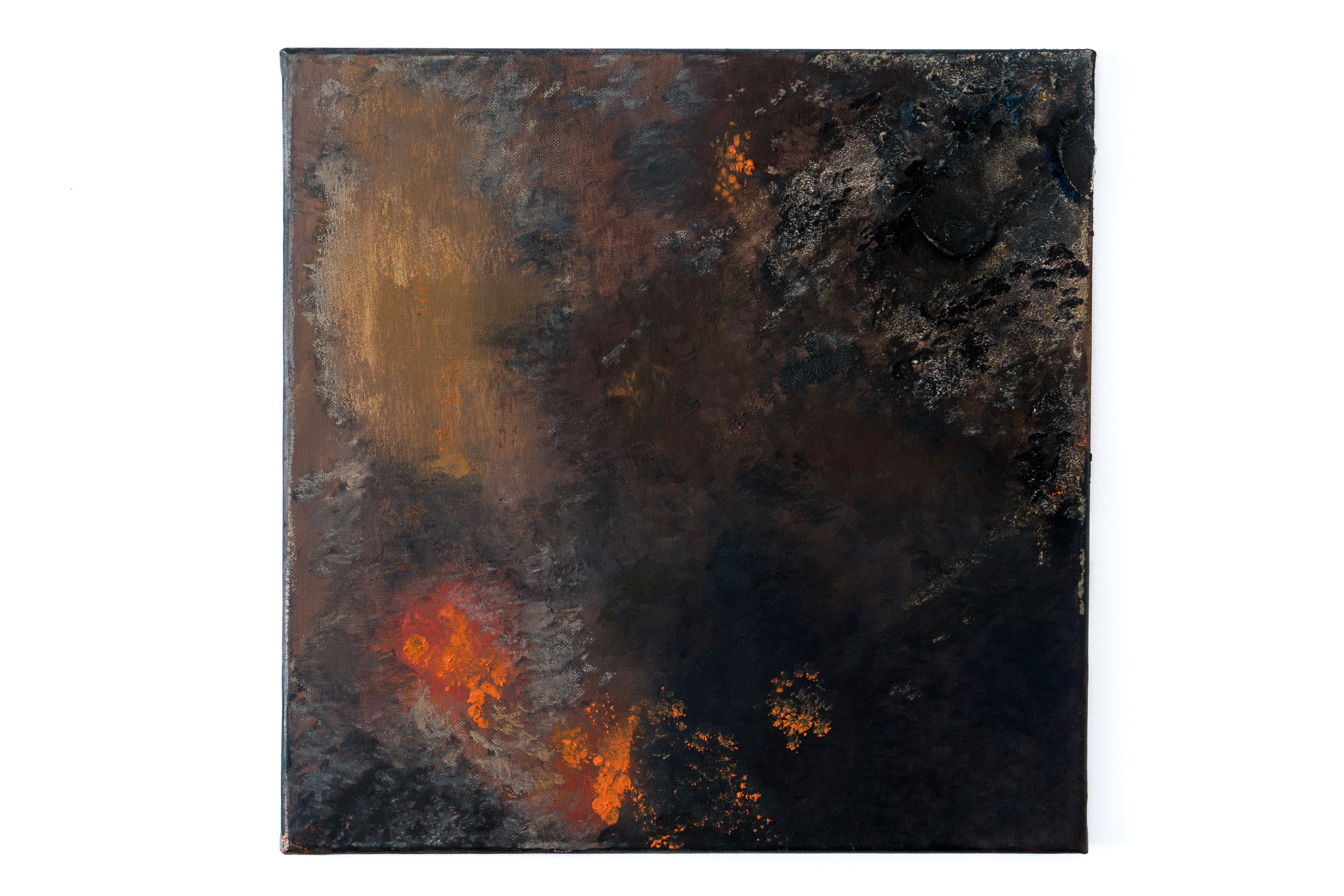 The painting exists in time. Perception shifts with light, with movement, with the hour. Metallic pigments catch and release. What you see at morning is not what you see at dusk. No image can hold this.