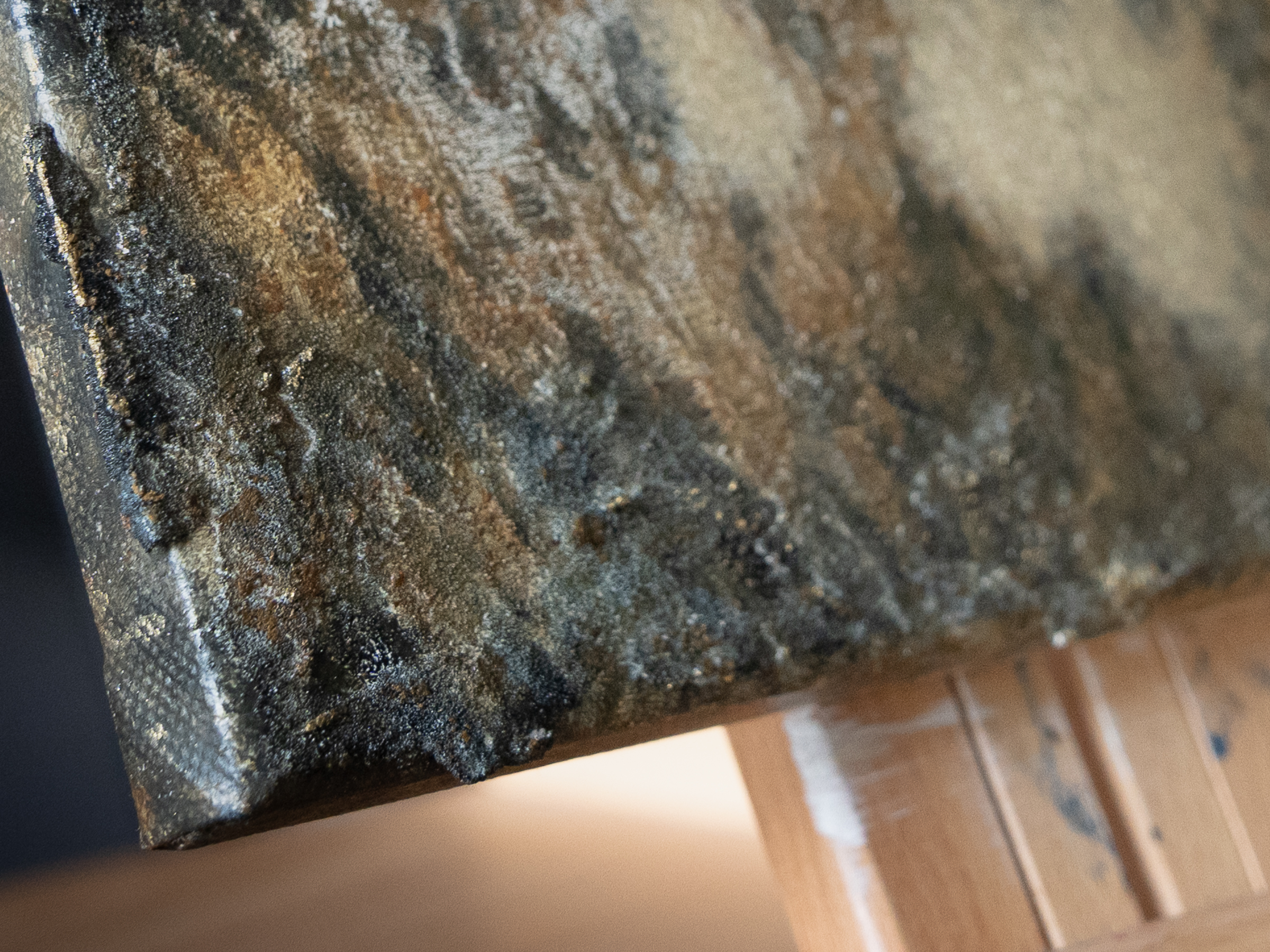 The painting exists in time. Perception shifts with light, with movement, with the hour. Metallic pigments catch and release. What you see at morning is not what you see at dusk. No image can hold this.